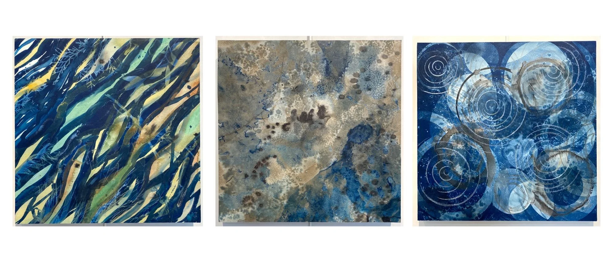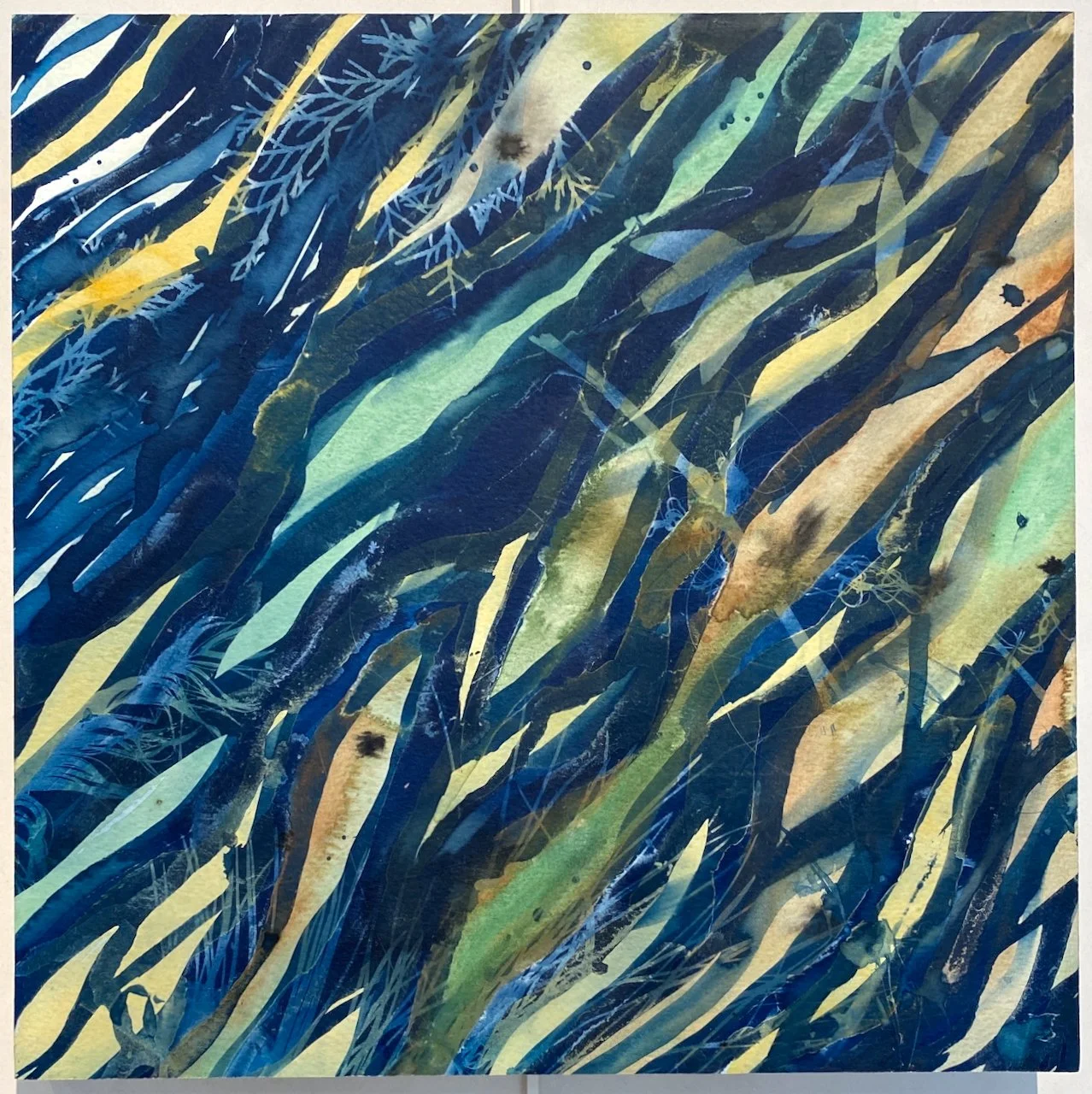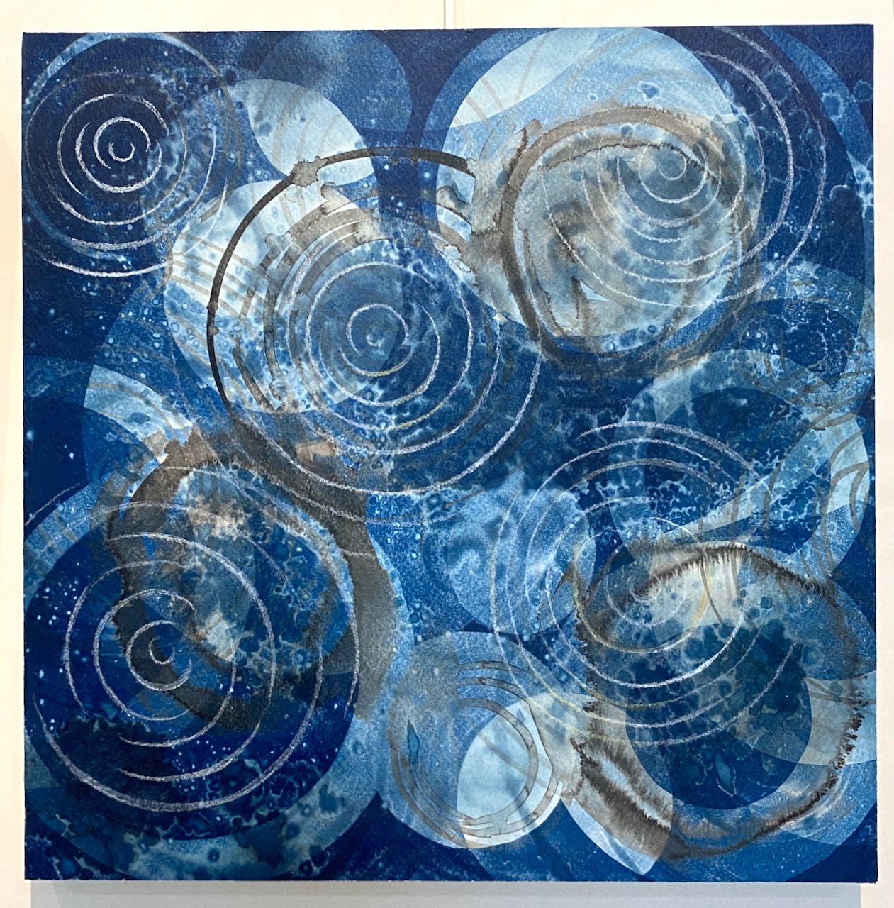 Gifts of Time, Refraction & Reflection, watercolor & cyanotype on paper on panel, sealed with cold wax, 14 x 14 in, 2025 - SOLD