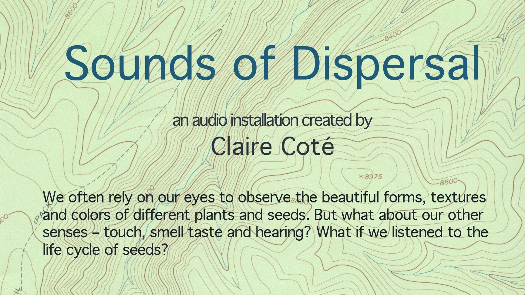 “Sounds of Dispersal” is an audio installation that explores the four main and less common modes of seed dispersal: gravity, wind, water and animals and fire and ballistic release. Within this ambient abstract collage, sounds of dispersal recorded from various locations around the world are woven into a loosely structured conversation of elements and players in the dispersal of seeds, inviting the listener to explore the life cycle of plants through sound.