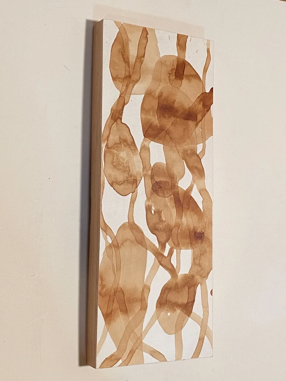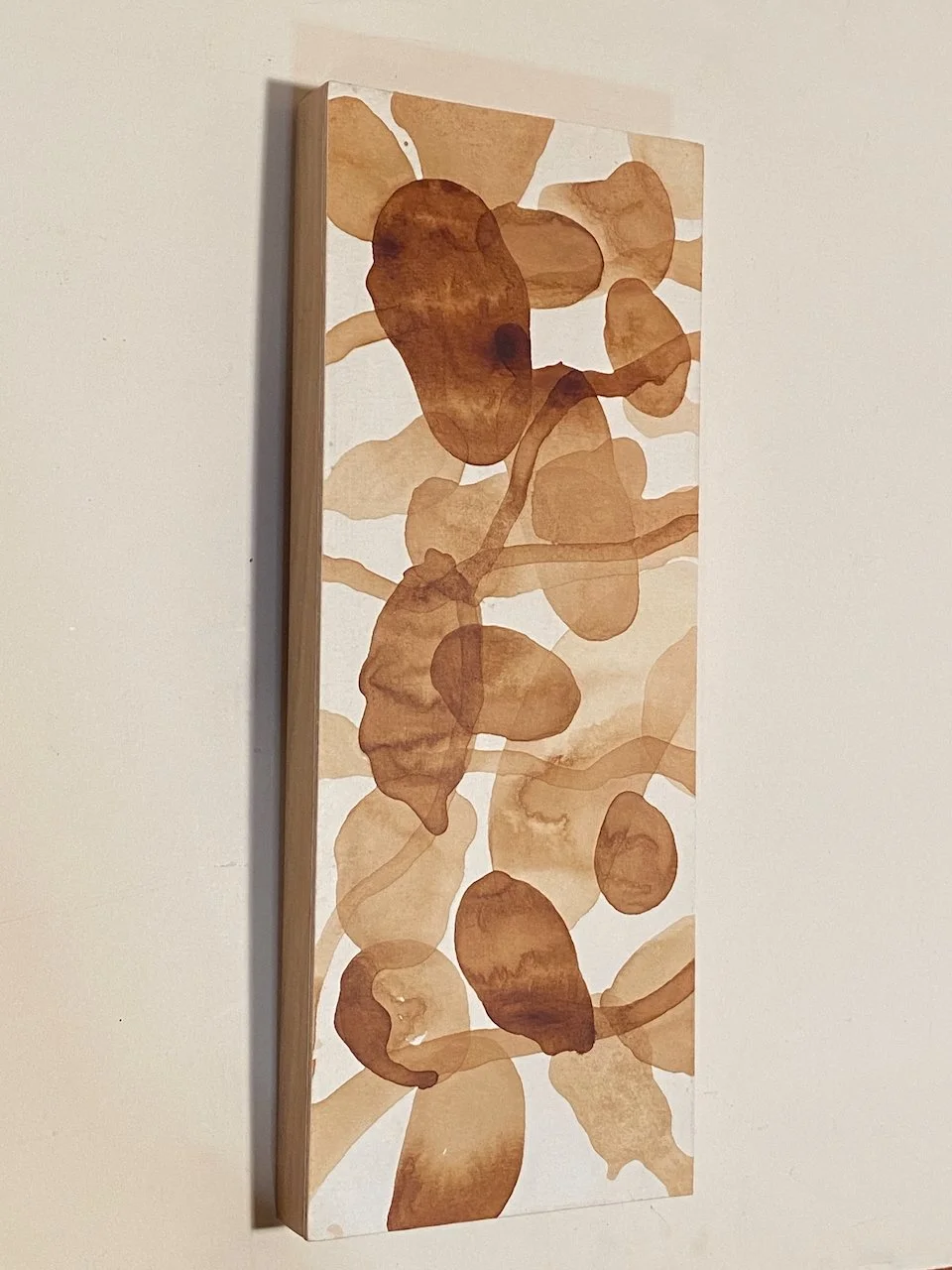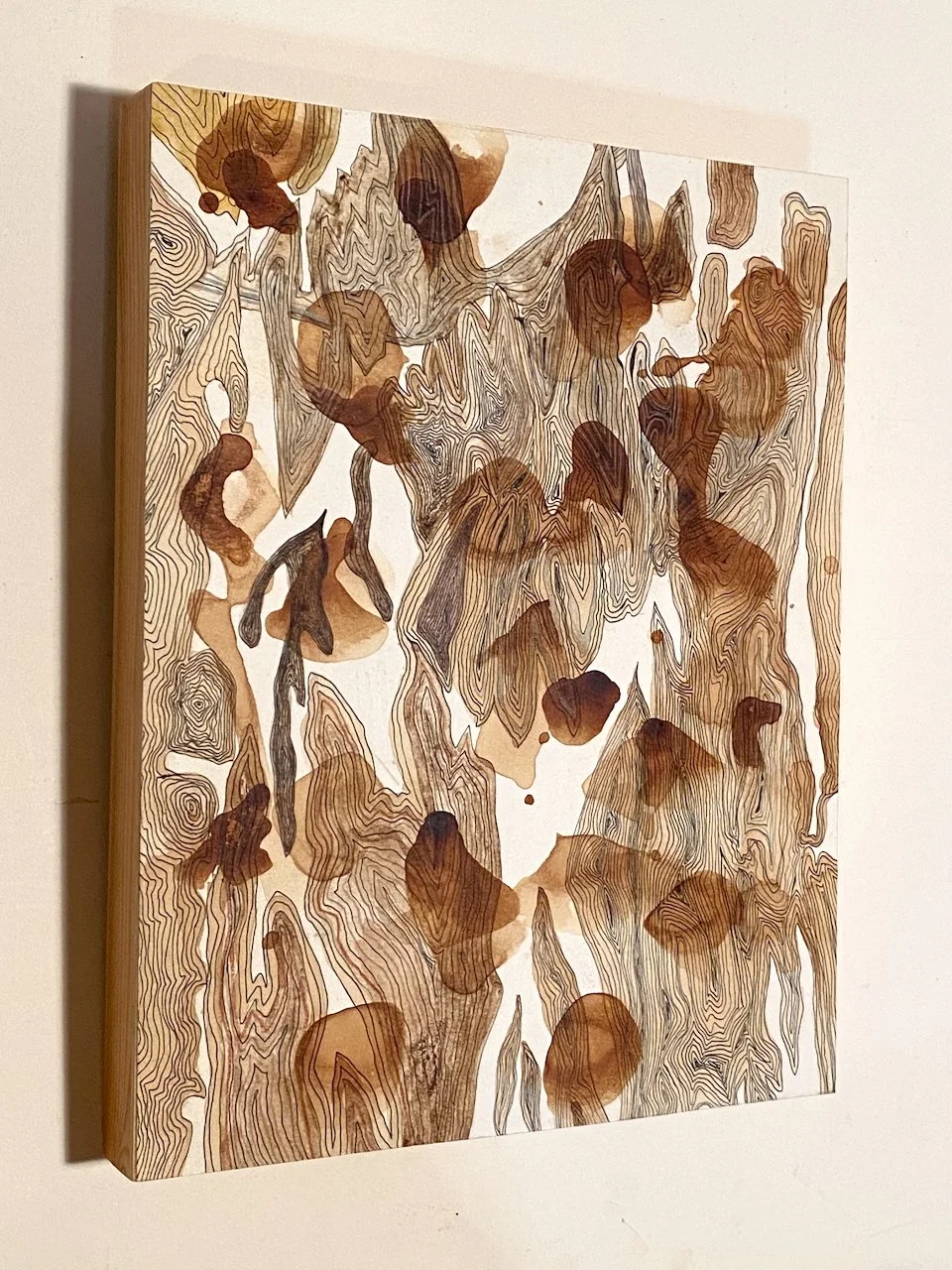 Created from salvaged black tea drips on paper on panel, cold wax finish