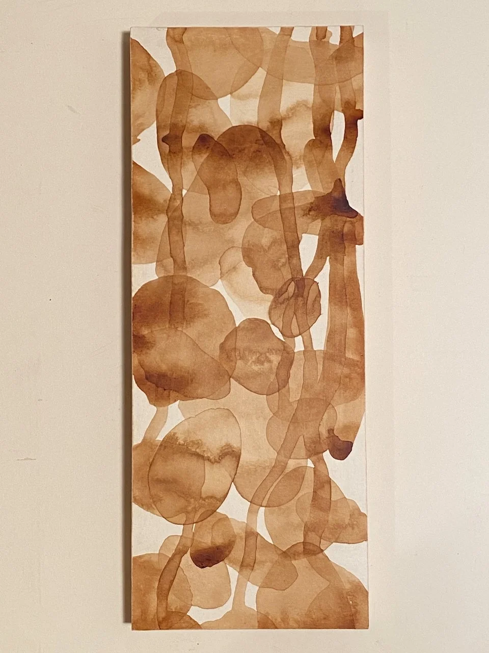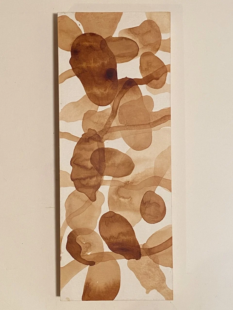 This series is a long-term layering of tea drips, marking weeks, months, years of a morning ritual. Each tea "tinaja" or rivulet is created from a slavaged black tea-drip gently squeezed from the teabag from my morning cuppa and applied to paper in that morning moment and left to dry. As the liquid evaporates, the mark changes. Day after day, these repurposed tea marks create a map of my mornings. Each tea tinaja becomes a footprint of a daily ritual of morning tea-drinking, the passage of time and the aesthetics of evaporation in our desert climate.